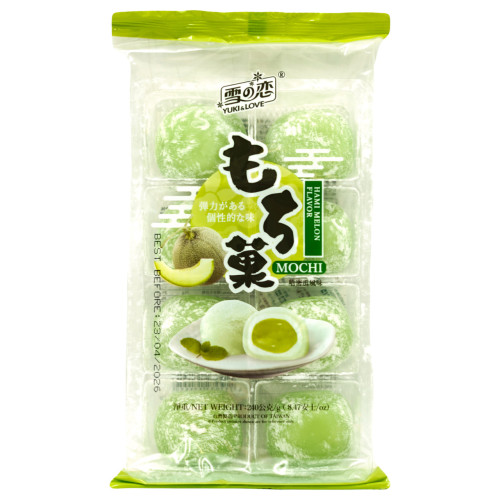 Мочі зі смаком дині Хамі YUKI&LOVE — це ніжний та екзотичний десерт, який поєднує в собі традиційну японську технологію та солодкий, соковитий смак китайської дині Хамі. Ці мочі (рисові тістечка) мають неймовірно м'яку, тягучу текстуру та ніжну начинку з ароматом дині. Кожен шматочок дарує справжнє задоволення, переносячи вас до світу азійських десертів. Упаковка вагою 240 г ідеально підходить, щоб насолодитися смаком самостійно або поділитися з друзями.