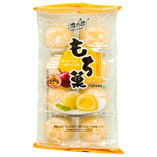 Мочі зі смаком маракуї YUKI&LOVE — це екзотичний японський десерт, який поєднує традиційну текстуру мочі з яскравим і освіжаючим смаком маракуї. Ці мочі (рисові тістечка) мають неймовірно м'яку, тягучу оболонку та соковиту фруктову начинку, що створює чудовий контраст смаків і текстур. Кожен шматочок дарує справжнє задоволення завдяки поєднанню солодкості та легкої кислинки маракуї. Упаковка вагою 240 г ідеально підходить, щоб насолодитися смаком самостійно або поділитися з друзями.