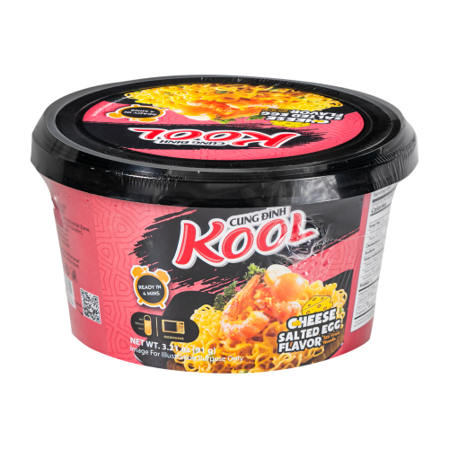 Локшина моментального приготування KOOL Cheese Salted Egg CUNG DINH вагою 91 грамів являє собою неординарне поєднання смаків, що інтригує гурманів. Еластична пшенична локшина зустрічається з кремовим сирним соусом, збагаченим пікантними відтінками солоного яйця, створюючи унікальну смакову палітру, яка вирізняється серед звичних варіантів швидкої локшини.