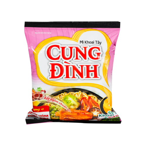 Локшина швидкого приготування Pork Ribs With Five Fruits CUNG DINH вагою 80 грамів – це незвичайне поєднання м'ясного смаку з фруктовою свіжістю. Пружна пшенична локшина чудово поєднується з насиченим бульйоном зі смаком свинячих реберець, доповненим легкими солодкувато-кислими нотками п'яти фруктів, створюючи оригінальний та пікантний смаковий букет.