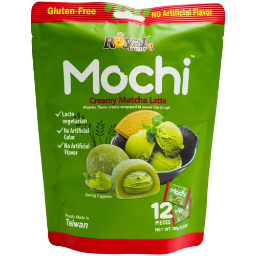 Тістечко моті з кремовим матча лате ROYAL FAMILY вагою 180 г – це ніжні японські тістечка моті з м'якою рисовою оболонкою та вишуканою начинкою зі смаком кремового матча лате. Вони поєднують еластичну текстуру моті з насиченим трав'янисто-солодким смаком матча, доповненим ніжною молочною кремовістю.