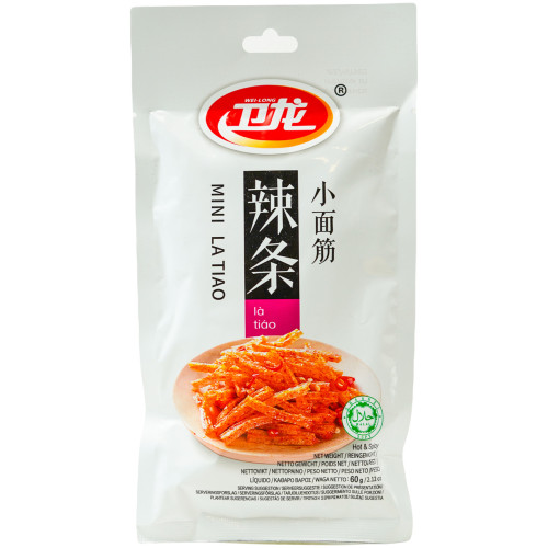 Снек латяо міні Latiao WEILONG вагою 60 г – це порційна упаковка популярного китайського гострого та пікантного снеку латяо від WEILONG. Ці невеликі смужки обробленої соєвої шкірки мають м'яку, злегка жувальну текстуру та насичений смак, що поєднує гостроту чилі, солодкість, умамі та аромат спецій. Це зручний варіант для швидкого гострого перекусу.