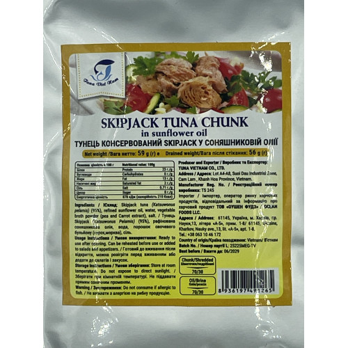 Тунець консервований шматочками — це високобілковий рибний продукт, упакований у невелику порційну банку вагою 59 грамів. Це ідеальне рішення для швидкого перекусу, додавання до страв або використання в дорозі. Консервований тунець цінується за його ніжне м'ясо, легкий морський смак та значний вміст корисних жирних кислот Омега-3.